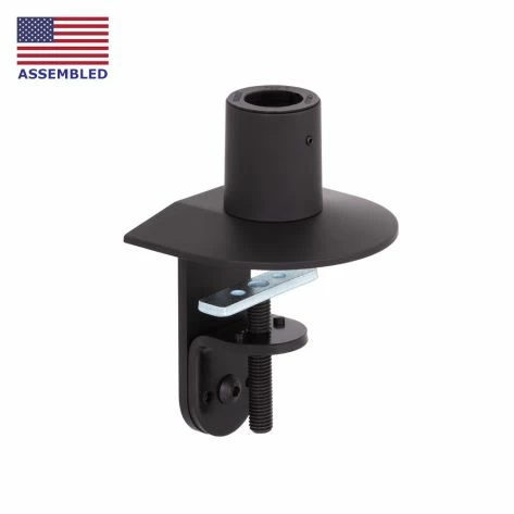 There are two configurations available to secure this can mount to a horizontal surface in three instances (and even more mounting configurations for applications not relevant to the question). It can either be clamped to the edge of a surface, clamped into a grommet hole, or it can be fastened with a nut and bolt through the surface. The clamping option works for surfaces up to 4.25" thick, whereas the through desk option must be between 0.38" and 3.25" thick.