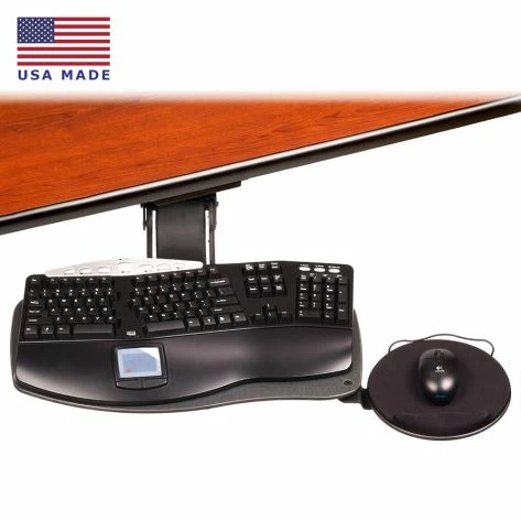 This adjustable keyboard tray system offers, as standard, the ability to rotate the mechanism a full 360° where the arm meets the track. Select the "front swivel" option if you would like to add the ability to rotate the keyboard tray 360° on the arm mechanism.