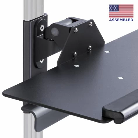 This articulating keyboard tray is the most versatile and flexible of the LeverLift keyboard tray sliding mounts. Not only does it provide sit-to-stand height adjustability, but it also has a large tilt range and swivels left to right. The tray can be folded up a full 90°, allowing the tray to be stored out of the way when not in use, extending out only 6.5 inches from the track mounting surface. It additionally provides another 45° of downwards tilt. The articulating tray is capable of swiveling a full 90° to each side, but is often limited by the edges touching the track mounting surface.
