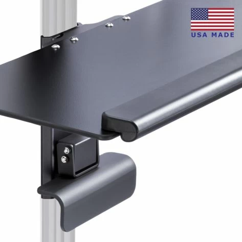 The height adjustable keyboard tray has two different keyboard platform sizes: 26" x 8.5" and 20" x 8.5". The 20" platform is more suited for compact keyboards while the larger size accommodates a keyboard with a number pad. Both sizes feature an ergonomic palmrest that runs the length of the front edge of the platform for additional comfort.