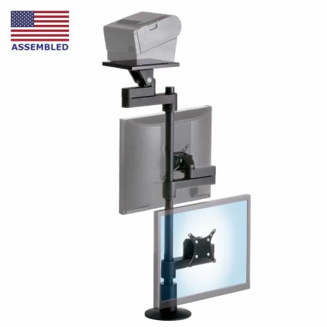 Set the resistance to movement for components appropriate to your requirements. Swivel, tilt and arm articulation can be set for easy movement or for resistance to movement. Touch Screen monitors require resistance to movement when in use. Alternately a monitor used by multiple users can be set for effortless repositioning. Resetting height is easily accomplished in less than 15 seconds. This triple arm, triple articulating POS pole mount system offers better lateral mobility to meet the needs of persons with ADA accessibility requirements. Bottom line: covers the needs of the retailer and customer with a smaller footprint.