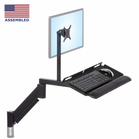 This heavy-duty LCD Monitor Arm with Keyboard Tray is very sturdy and designed for frequent keying sessions. The gas-spring cylinder is resistant to vertical travel because it uses a motion-resistant cylinder. The placement of the keyboard tray and LCD monitor in respect to one another is fixed. However, both the tray and LCD can be tilted to accommodate personal preferences. The TRS2818S is available with three tray options: the standard 20 inch wide platform, 26 inch wide platform and the 27 inch wide metal platform with palm rest. Note that the metal platform is heavier than the the other two, meaning that a system with the 27-inch tray will not be able to handle as heavy a monitor. Wire management molding below arm segments allows cabling to be managed below the arm.