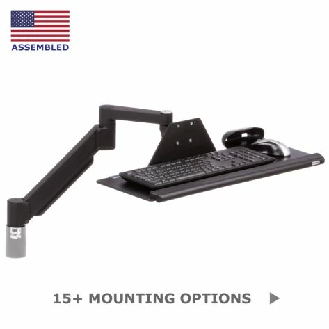 With Ergomart's Surface Mount Keyboard Tray system, it is easy to mount your keyboard and mouse or point-of-sale (POS) equipment above your work surface. The articulating arm can be conveniently clamped to the back of a desk or counter, mounted with a single bolt through the surface, or attached to a wall. Select from the standard 4-in-1 universal mount kit or the heavy-duty wall mount. This ergonomic keyboard arm allows for easy and infinite adjustment: tilt, swivel, rotate, and adjust height with ease! The TRS7000AKP has an available vertical travel of over 10 inches. At its highest point, the arm's horizontal reach is 30.5" and, when lowered, it provides 33" of reach. The arm rotates 360° at both the elbow joint and base, making it ideal for shared use. The TRS7000 AKP offers unparallelled tilt capability and can accommodate most recumbent and almost any sitting or standing positions.